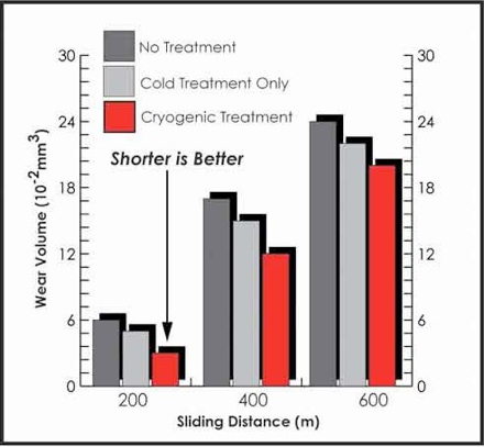 As this graphic from Japan’s Muroran Institute shows, cryogenics provides a huge decrease in wear volume as observed in sliding distance tests. In plain English, this means your tooling will last longer and wear better.